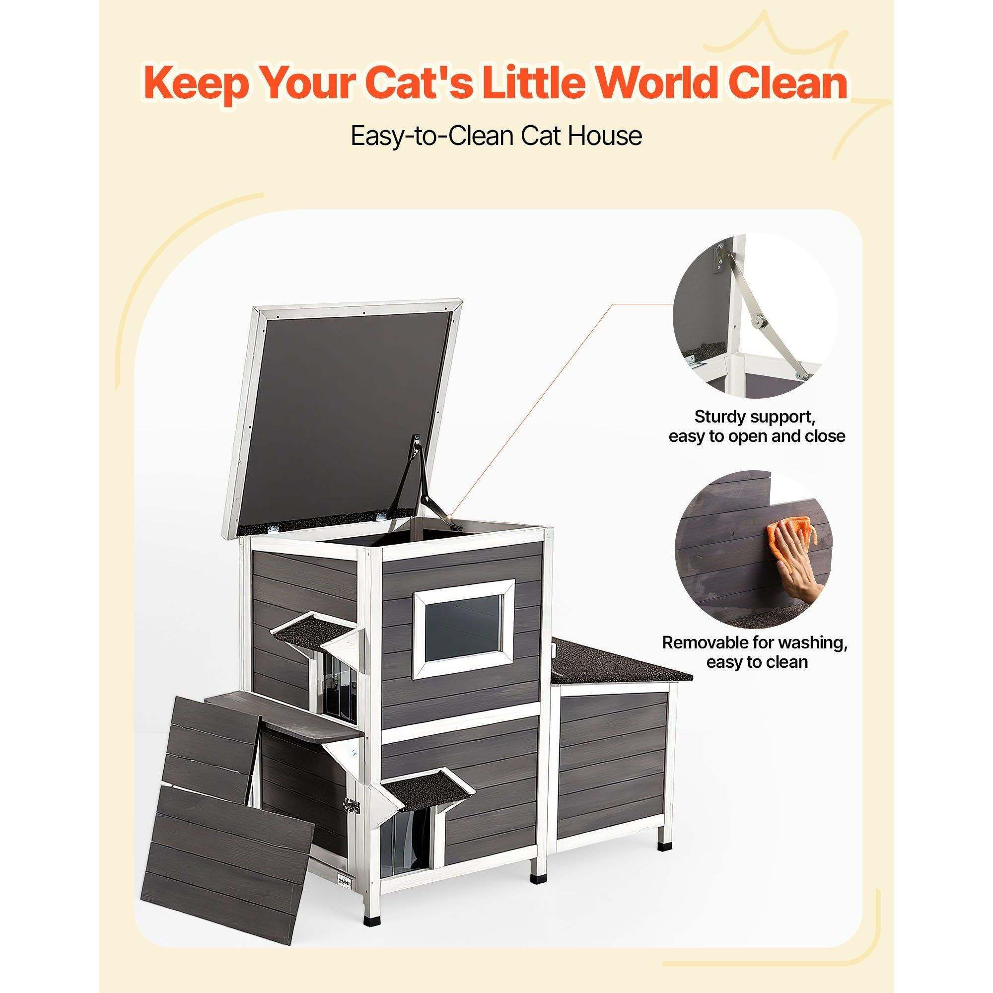This elevated cat house features dedicated feeding, resting, and play areas. Each area offers private space for cat, make it ideal for multi-cat households to reduce stress and provide private space.